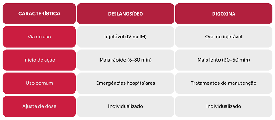 Em geral, o deslanosídeo é mais usado em situações emergenciais, enquanto a digoxina costuma ser mantida em tratamentos contínuos.