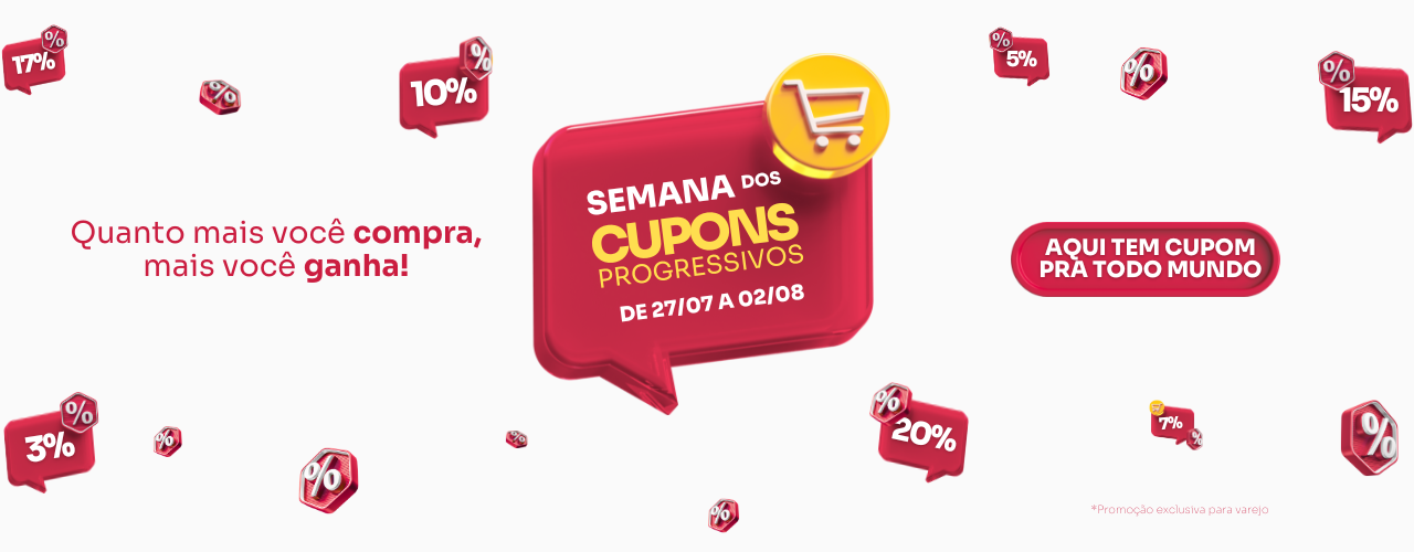 Do dia 27/07 até 02/08, você aproveita mais de 10 mil produtos com descontos que aumentam conforme o valor do pedido. Garanta já o seu cupom!